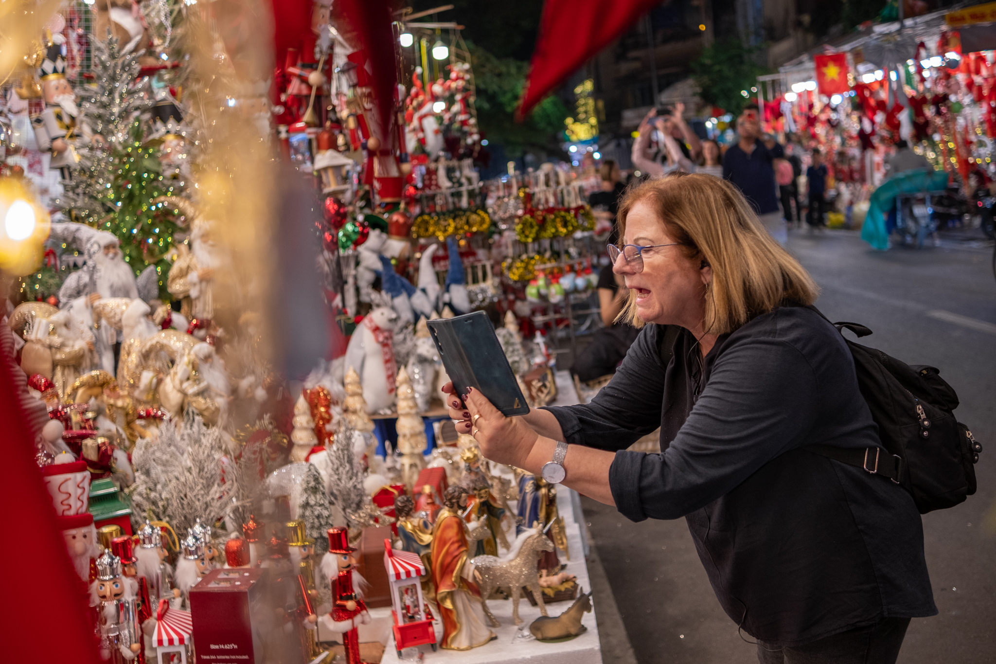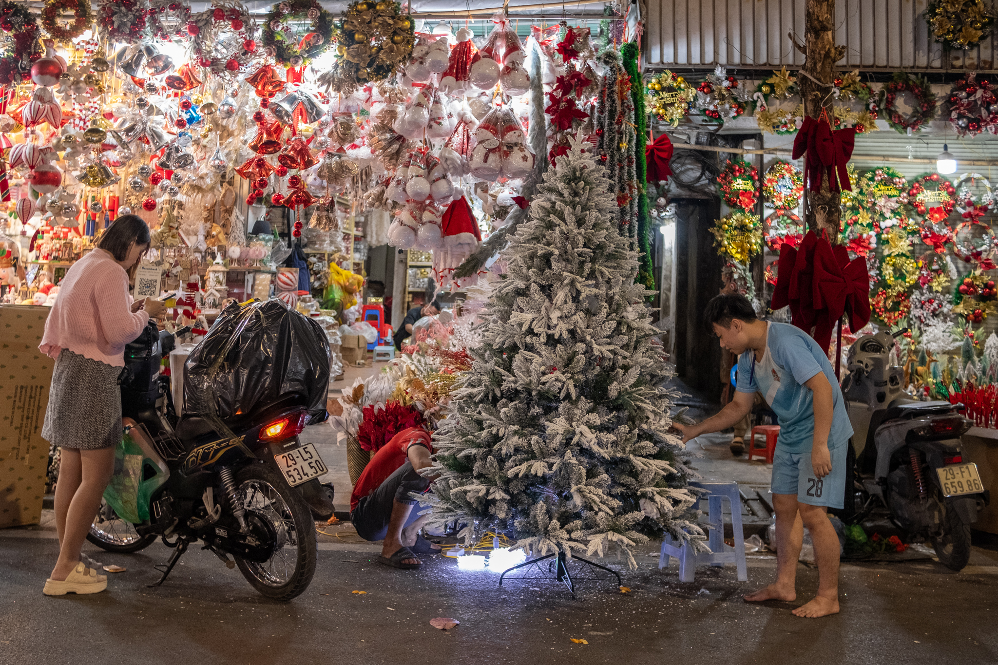 Các hộ kinh doanh trang trí nhiều phong cách cho cây thông Noel đưa đến những lựa chọn cho khách hàng. Cây thông đã được trang trí có giá từ khoảng 3-4 triệu đồng. Các mặt hàng trang trí cũng được bày bán rất nhiều dọc tuyến phố. Sắc màu đặc trưng đỏ, xanh, trắng rực rỡ của dịp lễ Giáng sinh thu hút nhiều người đổ về vui chơi, chụp ảnh lưu lại khoảnh khắc bên nhau của các cặp đôi. (Ảnh: Lữ Phụng Tiên)