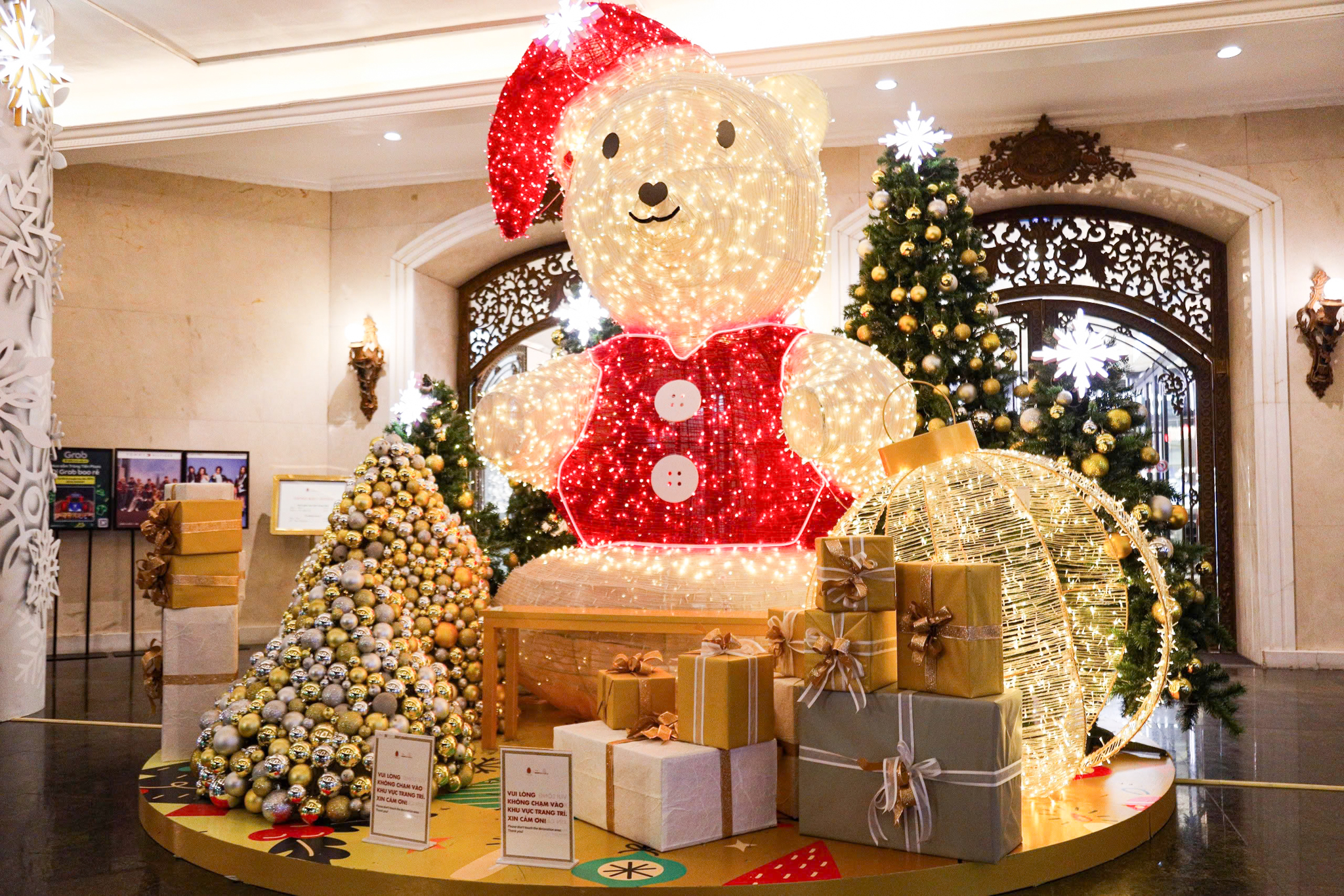 Một khách sạn lớn nằm gần khu vực trung tâm cũng được trang trí với cây thông Noel khổng lồ ở ngay phía sảnh trước.(Ảnh; Lữ Phụng Tiên)