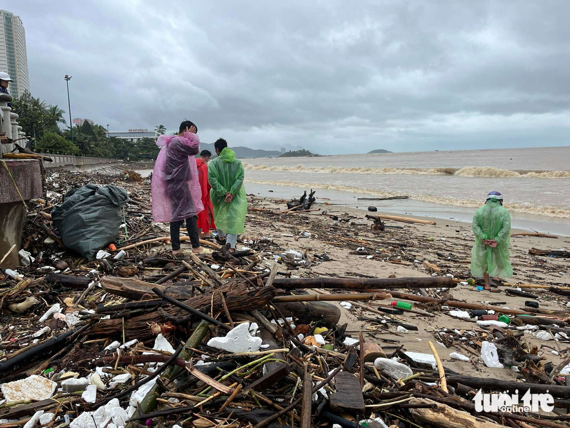 Sáng 21-11, sau khi lũ rút dần, rác thải ngập ngụa trên bãi biển Nha Trang tại khu vực phường Nha Trang - Ảnh: NGUYỄN HOÀNG