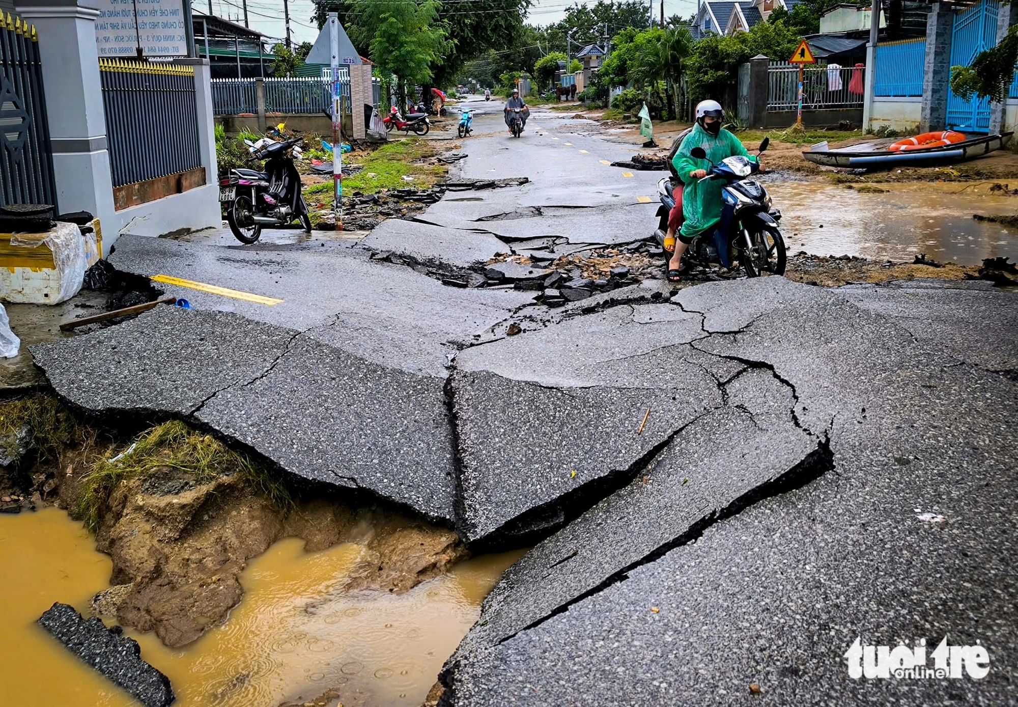 Tỉnh lộ 708 đoạn qua thôn Ninh Quý 3 (xã Phước Hậu, Ninh Thuận cũ) bị lũ xói - Ảnh: CHÂU TUẤN